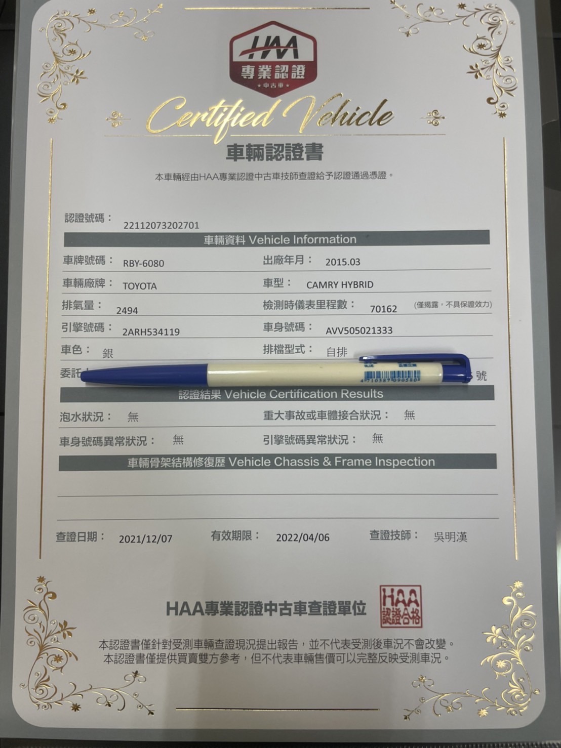 備註:HAA專業認證中古車,無重大事故,無泡水,附認證書