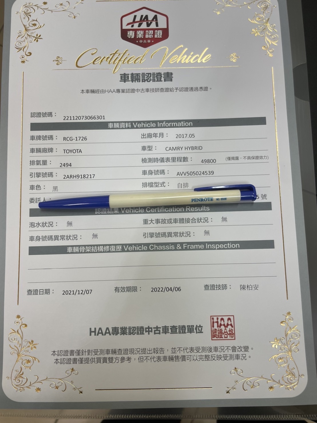 備註:HAA專業認證中古車,無重大事故,無泡水,附認證書